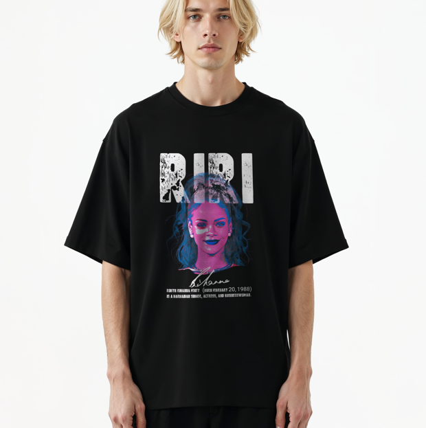 Camiseta Oversized 100% algodão, estampa RIRI - RIHANNA, escolha estampa nas costas ou na frente, camiseta de cor preta.